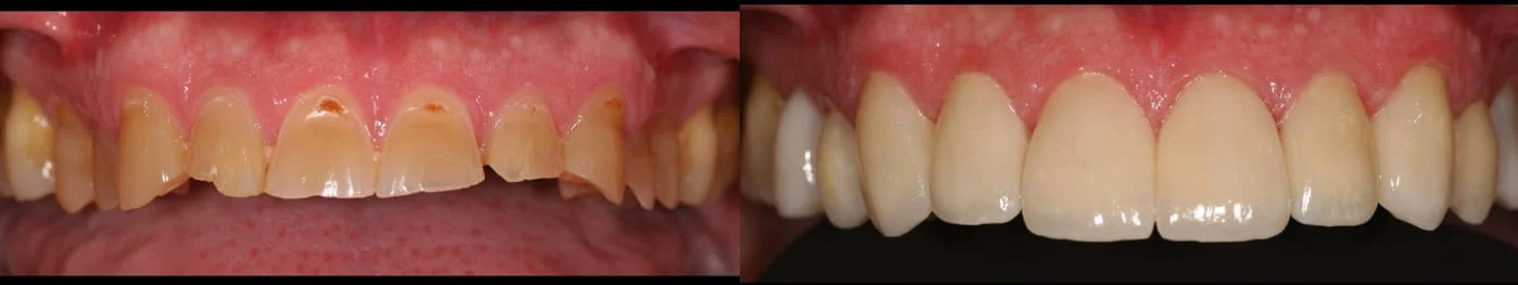 This British man had severely eroded teeth, which caused a collapsed bite. We were able to open his bite with crowns to re-establish the room for his bite and keep his teeth from failing.